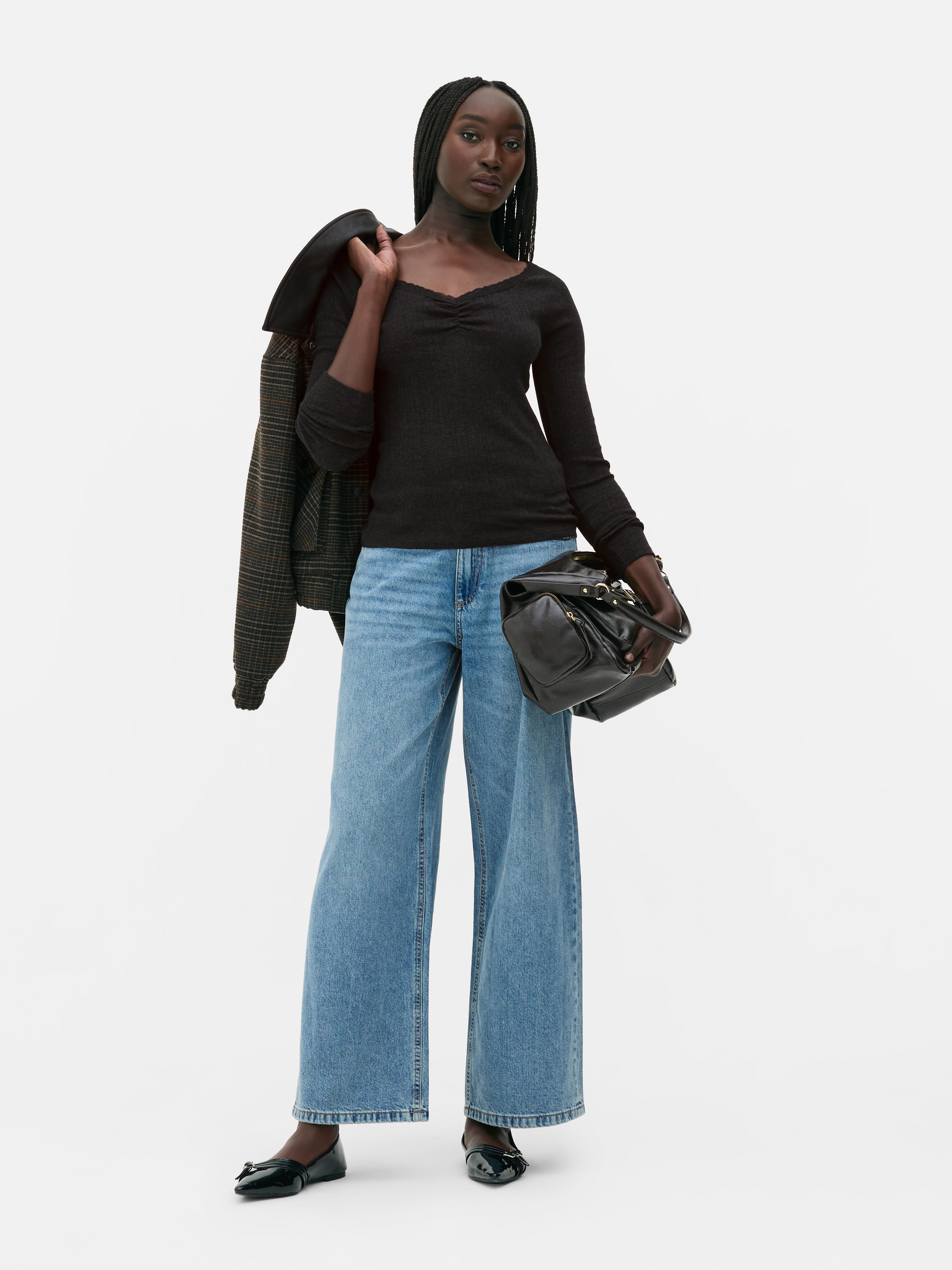 Lace-trimmed pointelle top with ruched detail and long sleeves