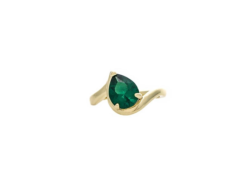 This elegant ring showcases a stunning pear-shaped Green cubic zirconia stone embraced by a fluid, sculpted band. The unique wrap-around design highlights the brilliance of the center stone while adding a modern, artful twist. Crafted in 18K gold-plated metal, it brings effortless sophistication to any jewelry collection.