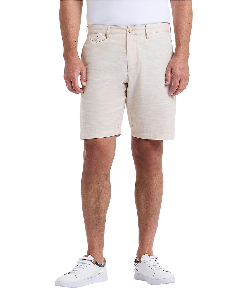 From Robert Graham, these shorts feature: Regular fit Zip fly with button closure Slant front pocket with contrast button holes Back welt pockets 8" inseam Cotton/linen Machine wash/tumble dry Imported.