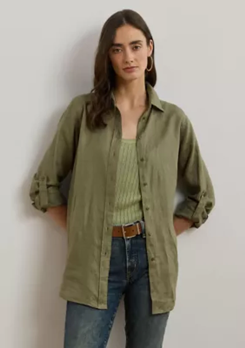 Light-as-air linen makes this shirt, designed with long roll-tab sleeves, a must-have for the season. Buttoned placket with "Lauren Ralph Lauren"-engraved buttons Point collar Long roll-tab sleeves with buttoned barrel cuffs Pleating at the cuffs Shirttail hem Relaxed fit Intended to hit at the hip Imported Product Specifications Size medium has a 29 in body length and a 32.5 in sleeve length; body length and sleeve length are taken from the center back of the neck, sleeve length changes 1 in between sizes Model is 5 ft 10 in/178 cm and wears a size small Material & Care Linen Dry clean