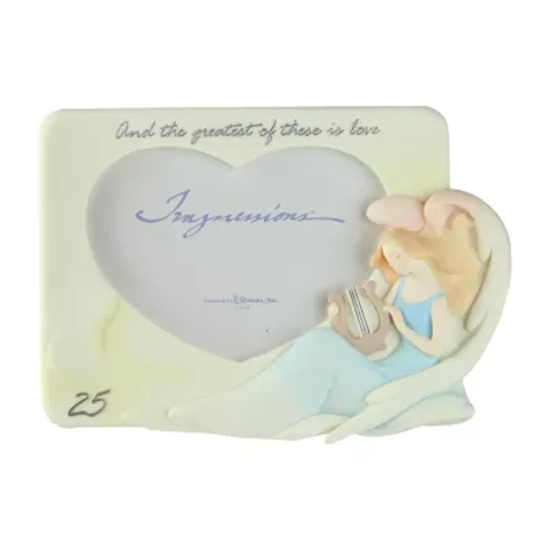 This 25th anniversary photo frame is a perfect accent to your silver anniversary celebration! The photo frame features the number "25" and an angel playing the harp. Capture some beautiful memories and place them in this stunning picture frame. Features: 25th anniversary picture frame. Frame is accented with an angel playing harp. Comes gift boxed. The phrase ("and the greatest of these is love") and the number 25 is written on the frame. Picture frame features a heart opening that holds a 4"x6" photo. Dimensions: 5.75"H x 1.25"W x 8"l. Material(s): porcelain