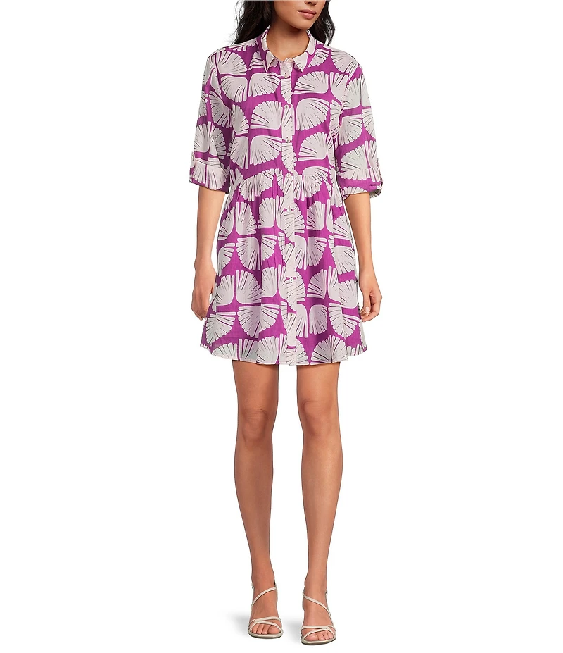 Ro's Garden Deauville Kyle Print Point Collar 3/4 Roll-Tab Sleeve Button Front Dress
