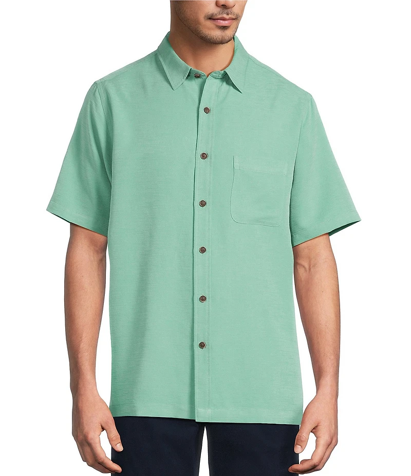 From Roundtree & Yorke, this sport shirt features: Solid slub fabric Point collar Short sleeves Button-front closure Patch pocket on the left side of the chest Squaretail hem Modal/polyester Machine wash/tumble dry Imported.