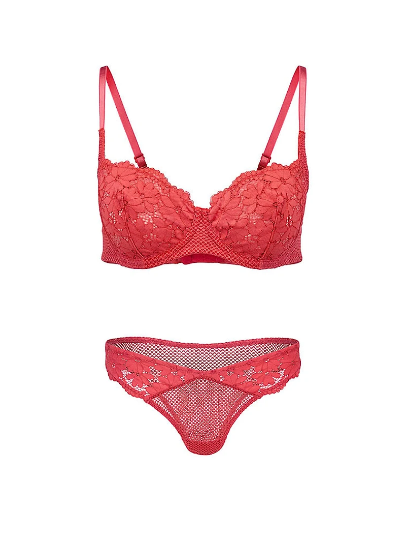 This unlined balconette bra is ideal for everyday wear, boasting floral lace with luxe fishnet details and a matching panty for a complete set.