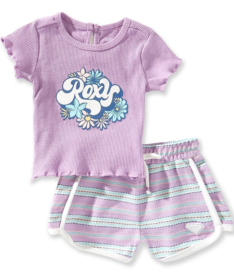 Roxy Baby Girls Short-Sleeve Ribbed Knit Logo Lettuce Edge Tee & Striped Shorts Set