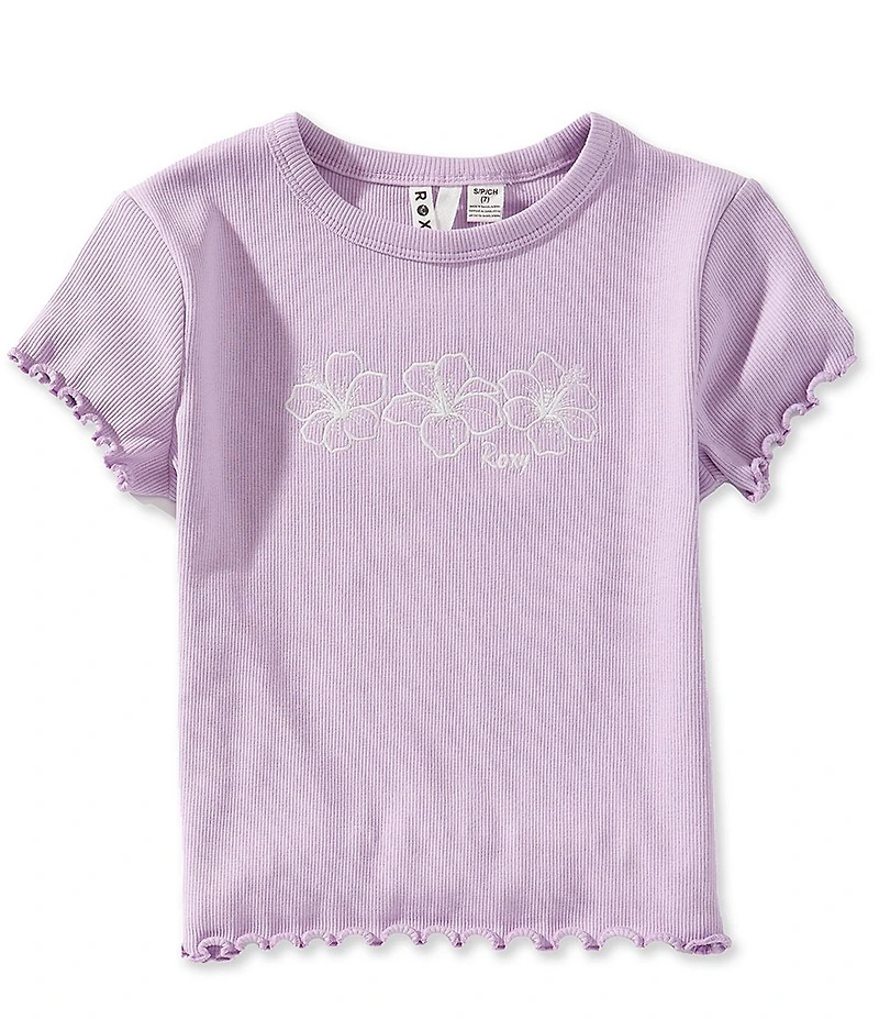 From Roxy, this t-shirt features: Round neckline Lettuce edging on the short sleeves and hem Hibiscus outline print and "Roxy" logo on the chest Pullover styling Cotton/polyester/elastane Machine wash/tumble dry Imported.