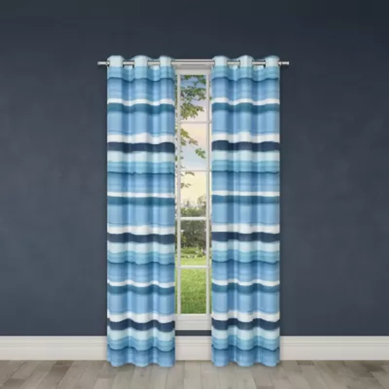 The balboa grommet window panel pair features an artistic watercolor horizontal stripe in shades of ocean blue, sky blue and white. A fresh breezy take on transitional fashion, these panels drape beautifully around your windowsill, and are an excellent addition to your home decor. Add the coordinating window valance and bedding collections to complete the look.