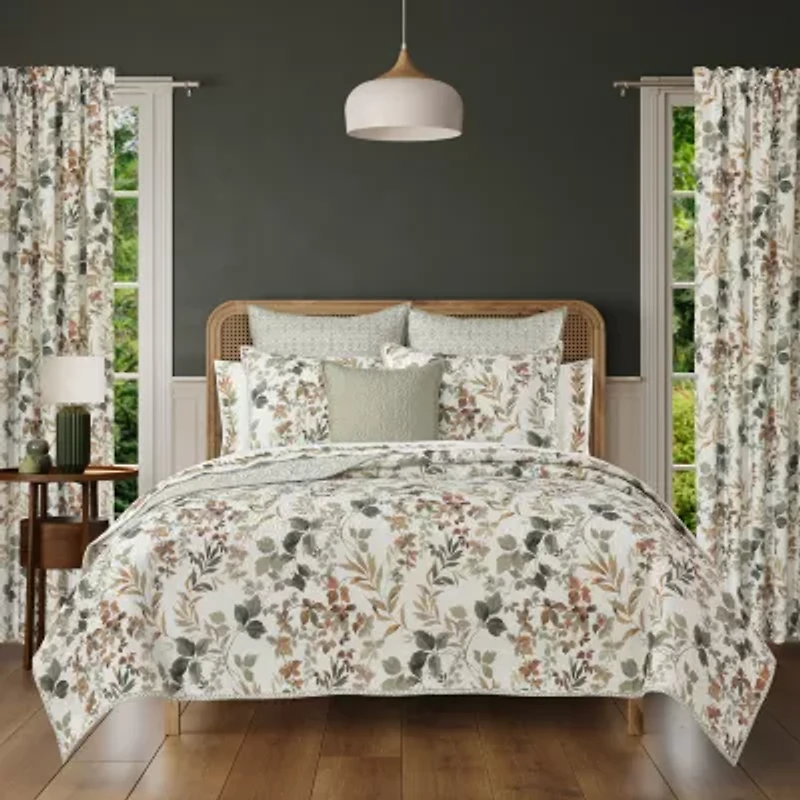 The evergreen quilt set features a botanical leaf design that brings the serenity of a lush garden into the splendor of your home. The vermicelli quilt design is printed on a lightly brushed microfiber in shades of sage, greens, and autumn golds. The quilt and sham reverse to a sage color ditsy leaf geo print for added versatility. Add the throw pillows, euro shams, and the window treatments to complete the serene look.