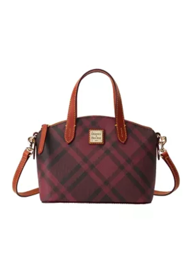 This Dooney & Bourke bag is a coated cotton fabric that has a plaid pattern. It's both modern and a little bit retro. An uncomplicated silhouette can be carried as a satchel or a crossbody for a hands-free day. 25". handle drop, 3.5" drop crossbody One inside zip pocket, two inside slip pockets Imported Product Specifications H 7" x W 4" x L 9.5" Material & Care Coated cotton Clean with a soft cloth