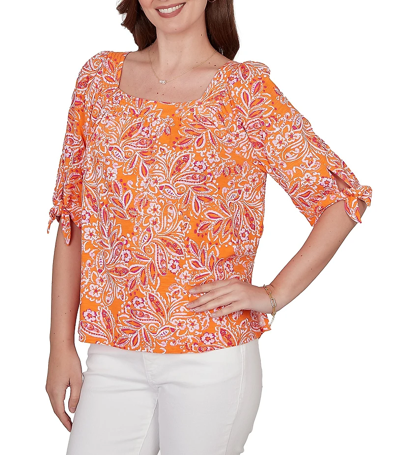 From Ruby Rd., this top features: Knit fabrication Square neckline 3/4 sleeves with tie detailing Paisley print Straight hem Pullover construction Rayon/spandex Machine wash cold Imported. This paisley print knit top blends soft pattern with thoughtful detail. A square neckline gives it a modern edge, while tie accents at the sleeves add a feminine finish. Three-quarter sleeves provide easy coverage without feeling heavy. A versatile top that feels both relaxed and styled.
