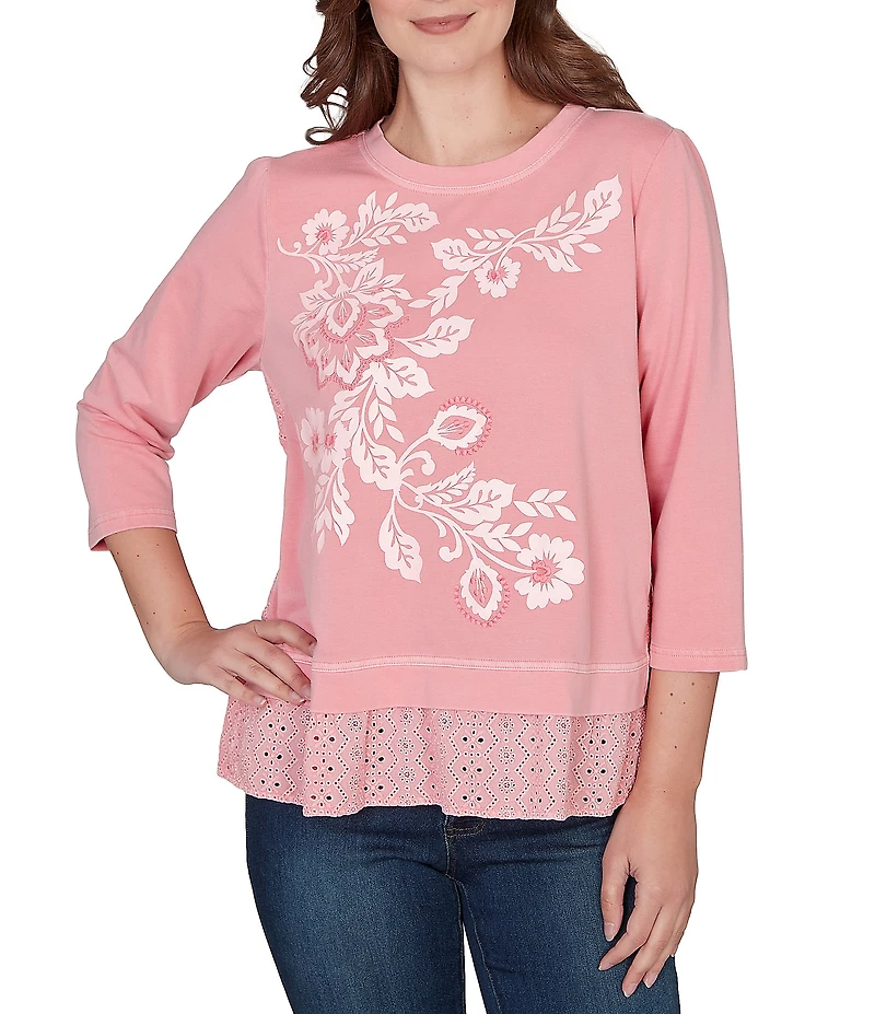 Ruby Rd. Petite Size French Terry Knit Floral Embroidered Eyelet Accents Top