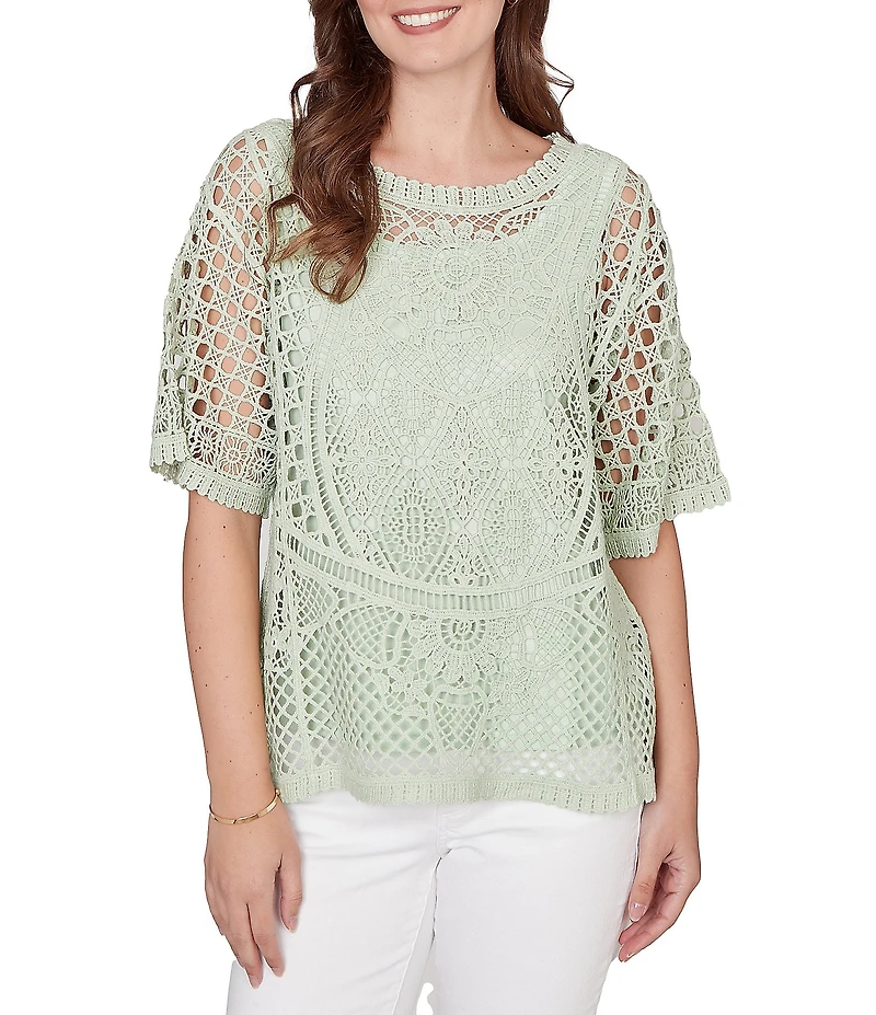 From Ruby Rd. Petite, this knit top features: Open-work knit fabrication Crew neckline 3/4 sleeves Tonal tank lining for comfortable coverage Soft balance of texture and structure Straight hem Pullover construction Cotton Hand wash cold Imported. This pullover sweater features intricate chemical lace layered over a tonal tank lining for comfortable coverage. Designed with a jewel neckline and three-quarter sleeves, it offers a soft balance of texture and structure. The built-in lining keeps the look effortless and easy to wear. A refined sweater that adds detail without feeling heavy.