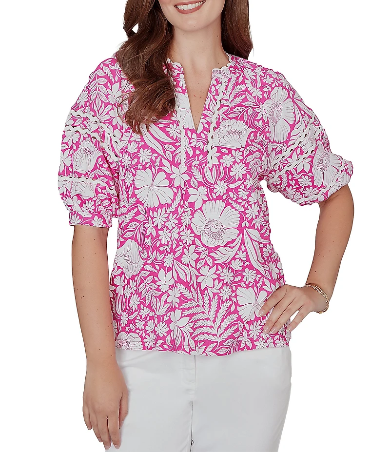 Ruby Rd. Petite Size Tropical Floral Split V-Neck Elbow Sleeve Top