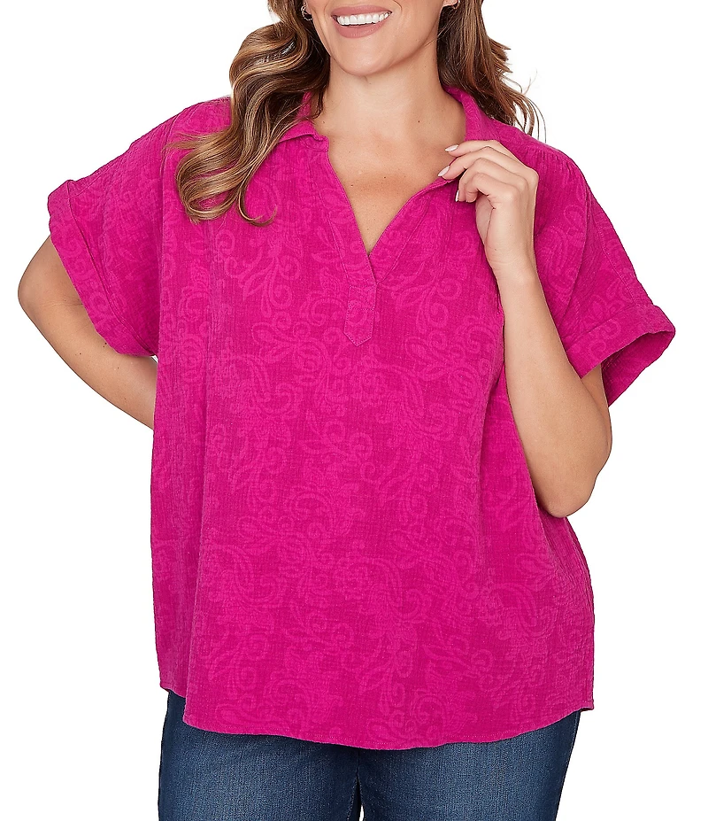 Ruby Rd. Plus Size Embossed Gauze Woven Paisley Spread Collar Short Rolled Sleeves Top