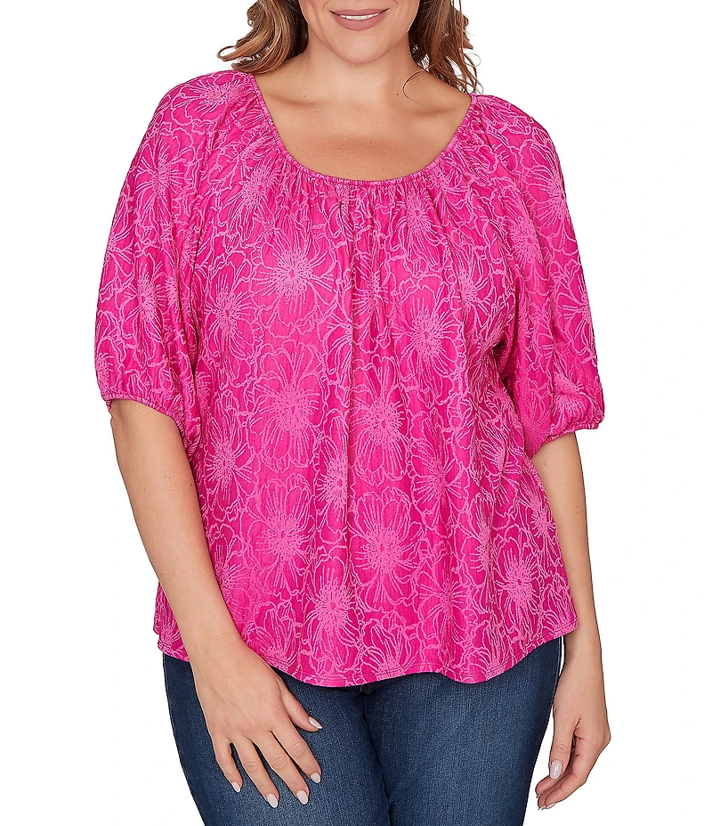 Ruby Rd. Plus Size Textured Jacquard Floral Scoop Neck Elbow Sleeve Top