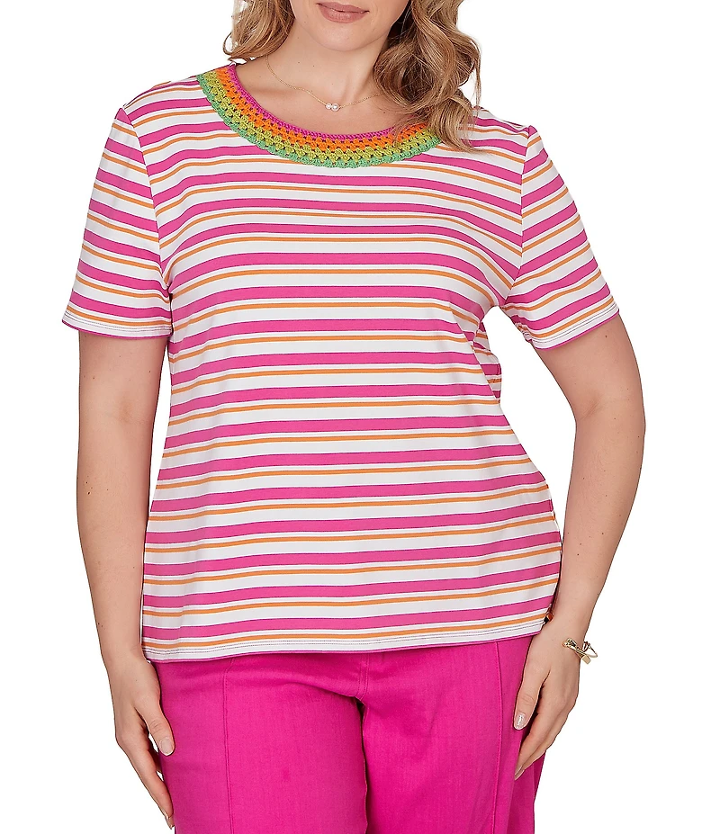 Ruby Rd. Plus Size Yarn-Dyed Stripe Crochet Embellished Scoop Neck Short Sleeve Tee