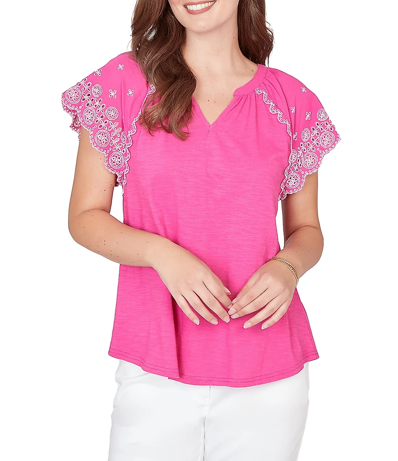 Ruby Rd. Slub Knit Split V-Neck Short Embroidered Sleeve Top