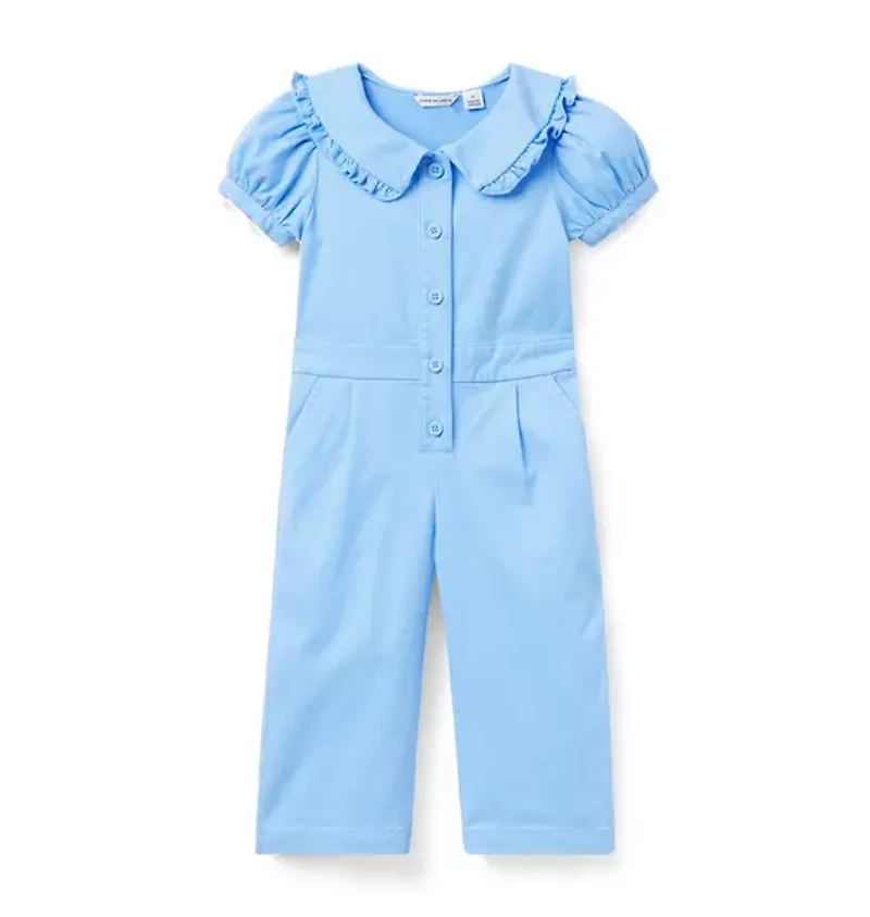 A one-and-done favorite, our jumpsuit is designed in soft stretch twill. Featuring a wide leg silhouette, puff sleeves and a ruffle trimmed collar, of course. It's effortless style at its best. 74% Cotton Twill/24% Polyester/2% Spandex Short Sleeve Button Front Front Pockets Online Exclusive Machine Washable; Imported