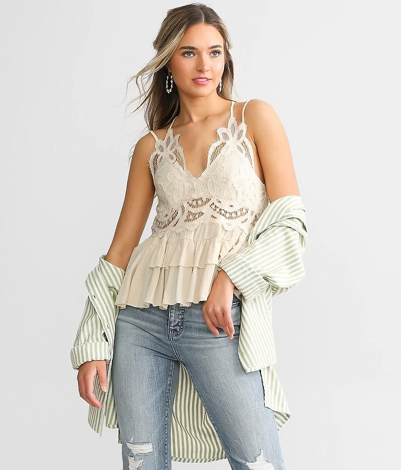Lined bust crochet tank Tiered ruffle crinkle hem Adjustable crisscross straps Elasticized waistband Bust measures 26" on size small Body length up to 22" on size small