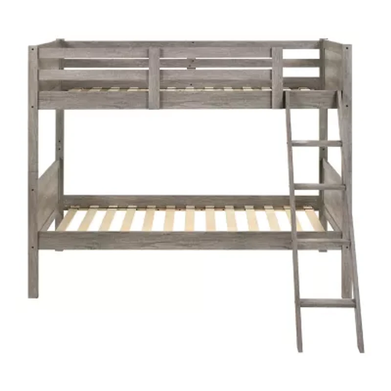 Minimal, clean shapes and lines invite you to rest in this transitional bunk bed. Designed in a weathered taupe finish accented by a dark border along the sides, this understated bunk bed is the perfect addition to a modern farmhouse home, or a contemporary bedroom suite shared by siblings. A built-in ladder makes climbing to the top bunk a breeze, as side guardrails keep you tucked in tight. A smart addition to compact bedrooms, freeing up floor space, this bunk bed is also extremely versatile and can be separated to create two beds as well. Functional and stylish, this bunk bed can be appreciated by young children, tweens and adolescents.