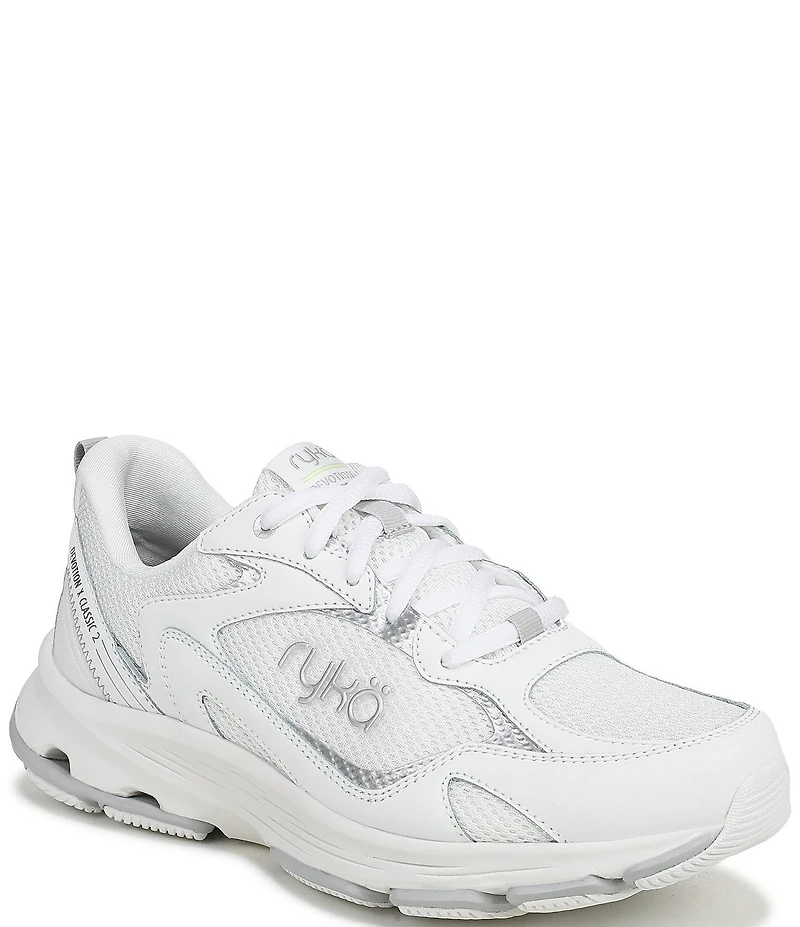 From Ryka, the Women's Devotion X Classic 2 Fitness Walking Sneakers feature: Breathable mesh fabric upper with leather overlays and 3D printed design Padded heel and tongue Lace up closure with heel pull tab for easy on/off Fabric lining Anatomical insole for arch and heel support ACTIVfoam™ EVA midsole for soft cushioning with built-up cushion in the midfoot for stability  Full-length RE-ZORB® responsive cushioning for shock absorption and impact protection, plus extra RE-ZORB® in the forefoot and heel Durable rubber outsole for grip with built-in compression channels for shock absorption Approx. 1.75" heel height Weight: 280 g/9.9 oz per shoe Heel-to-toe drop: 10 mm Imported.