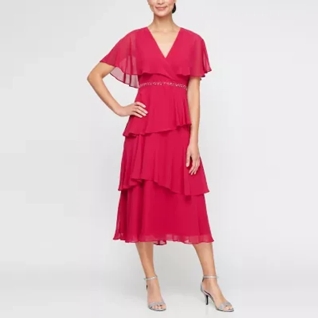 S. L. Fashions Womens Short Sleeve Embellished Midi Fit + Flare Dress