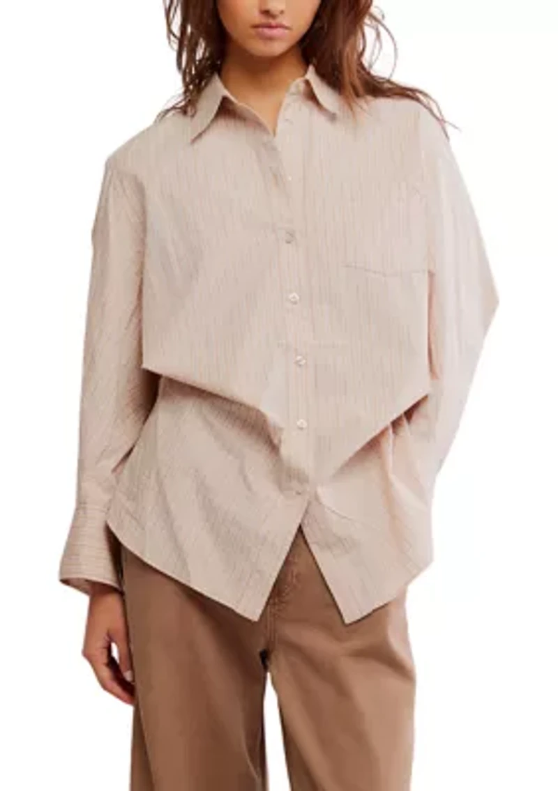 Your new go-to shirt, now in stripes. A bold twist on a classic, this staple button-down is crafted from crisp cotton and designed with a unique cinched silhouette—making it anything but ordinary, yet just as essential. Fit: Relaxed, cinched at waist Features: Cotton poplin fabrication, darting at front for waist-accentuating effect, collared neckline, button-front closure, patch pocket, drop-shoulder dolman sleeves, button cuffs, back pleats, striped print Imported Product Specifications 31.75" L Material & Care 100% Cotton Machine washable