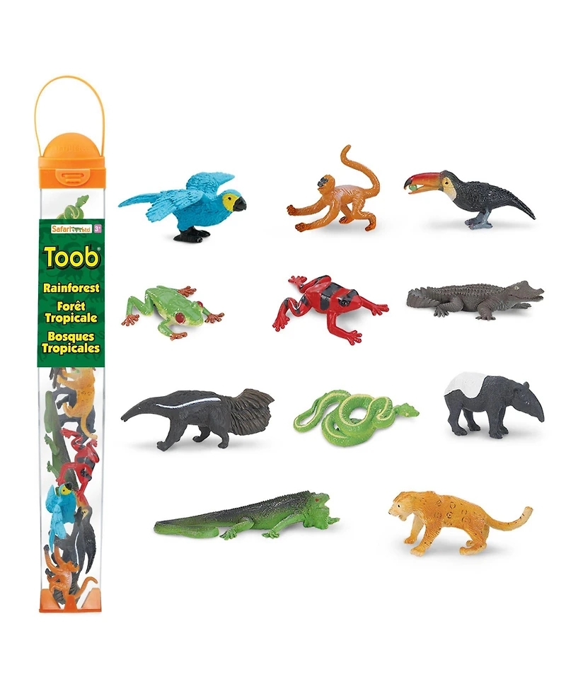 Embark on a fascinating journey through the densest jungles with Safari Ltd.'s Rainforest Toob! This collection includes 11 mini figurines, each representing a unique species found in rainforests, including the vibrant macaw, the hopping red eye tree frog, the lurking caiman, and many more.Each figurine in this collection is professionally hand-painted, showcasing the unique colors and characteristics of these rainforest creatures with lifelike detail. These figures are not only fun to play with but also excellent educational tools, offering insights into the variety of life found in rainforests and their roles in one of Earth's most bustling ecosystems.