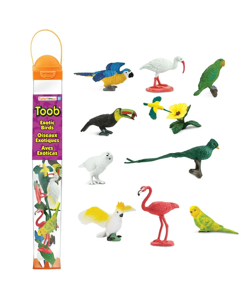 Enter a world of feathered beauty with Safari Ltd.'s Exotic Birds Toob! This collection features 10 miniature bird figurines, each representing a unique species of exotic birds from diverse regions of the world. This set includes a parakeet, quetzal, yellow macaw, hummingbird, hibiscus flower, keel-billed toucan, cockatoo, flamingo, white ibis, snowy owl, and a great parrot.Each bird figurine in this collection is meticulously hand-painted, showcasing the unique colors and features of these exotic birds with stunning realism. These figurines make not only fun toys but also exceptional educational tools, offering insights into the unique adaptations and behaviors of these bird species and their roles in tropical ecosystems.
