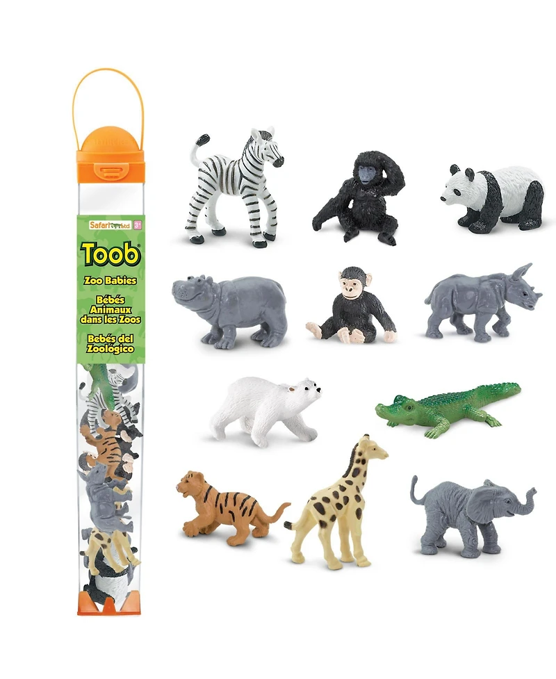 Step into the delightful world of baby zoo animals with Safari Ltd.'s Zoo Babies Toob! This collection includes 11 miniature figurines of beloved baby animals you'd find in zoos worldwide, such as a zebra, panda, hippo, chimpanzee, rhino, alligator, gorilla, elephant, tiger, polar bear, and giraffe.Each figurine is professionally sculpted and individually hand-painted, bringing a touch of the zoo right into your home. From feeding the panda cub some bamboo to taking a swim with the baby polar bear, these lifelike miniatures open up a world of imaginative play and learning. They are great for teaching about the natural world and the life cycles of animals.