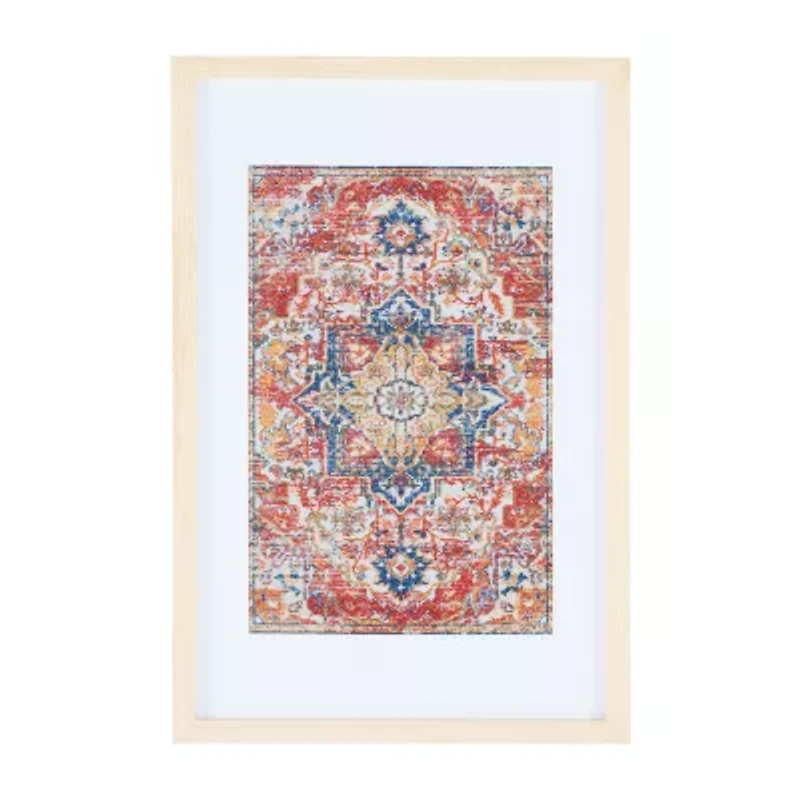 Give a dramatic and enchanting finishing touch to your walls with our prestigious lonqu framed textile wall art. Inspired by rich and opulent Persian rugs, our wall art showcases striking symmetry and rhythmic patterns. The textile is adorned in a powerful combo of navy blue and red to warm up your walls with a touch of luxury. Elegantly encased within a wooden frame, our textile wall art remains a dramatic and charming addition to your home.