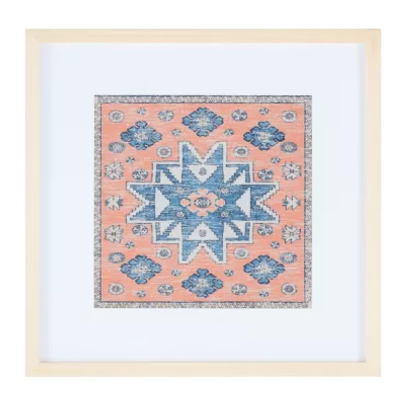 Give a lively update to your home with the chic design and lush textures for our Harjo framed textile wall art. Its abstract and fascinating motifs are accentuated with a strong sense of symmetry. Showcasing a soothing combo of blue and terracotta hues, the wall art lends a lively pop of color and motifs. It is elegantly encased in a wooden frame to serve as an artful focal point for your gallery wall.
