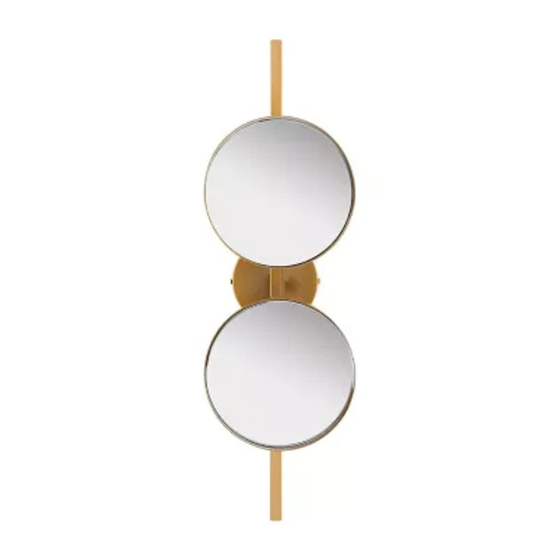 Brighten up any corner with the high-style and captivating appeal of our Ileva mirror. Two round mirrors are aligned on an iron base to serve as an alluring centerpiece for your home. A gleaming gold finish brings a polished touch of luxury to our mirror. It can be backlit with 2 light bulbs to emit a soft and pleasant light, elevating both the style and ambiance of your home. Our accent mirror can stand alone or be arranged in multiples to create a stylish and dramatic display in your entryway, living area, or bedroom.
