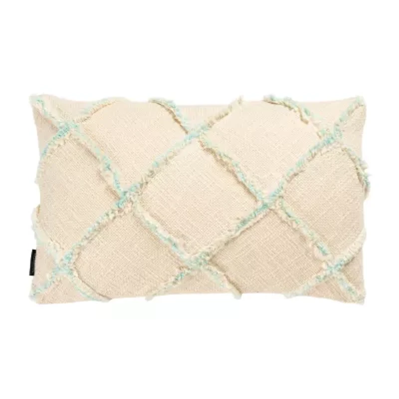 Bring textural intrigue and visual interest to your decor with this fabulous Ashlin pillow. Ashlin's soft beige cotton is given a unique, eye-catching finishing touch with its shabby-chic overall fringe latticework in contrasting teal.