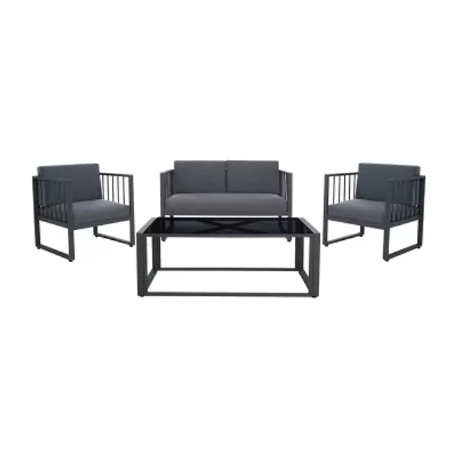 A contemporary update of classic British garden furniture, circle insets distinguish the slatted seat backs of the Montclair 4-piece outdoor living set. Crafted of sustainable acacia wood, the set features all weather cushions.