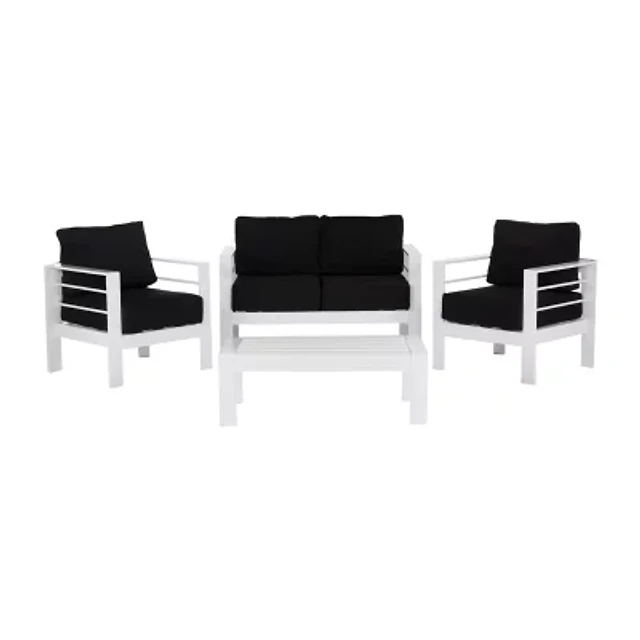 Smooth and sleek, this contemporary 4 piece outdoor living set was inspired by madrid's latest lounge destination. Its modern angles are paired with upholstery for a relaxed elegant seating. Its minimalist table brings it all together.