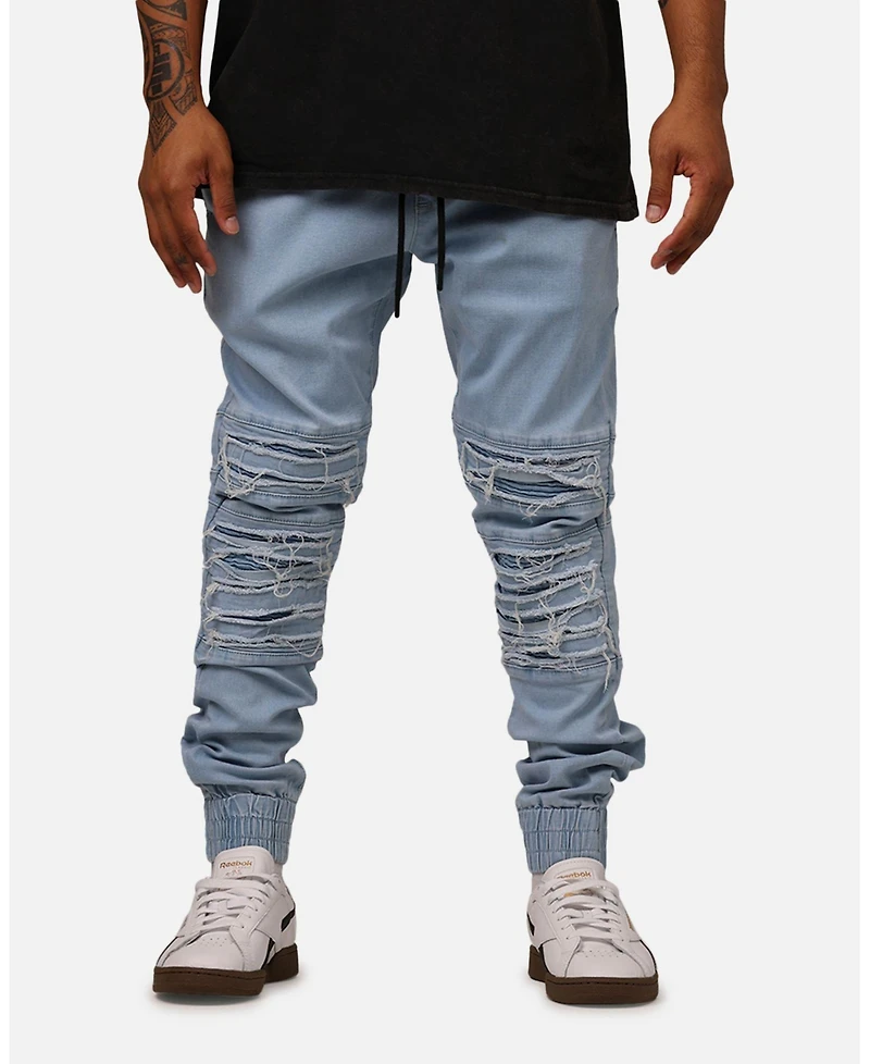 Saint Morta has delved deep into their bag of tricks and produced a pair of pants that will have you covered when you need it most. These Joggers feature an elastic waist with drawcord, dual front and rear pockets, Saint Morta print on the back pocket, tapered fit through the legs, heavily distressed biker style panels above and below the knee.
