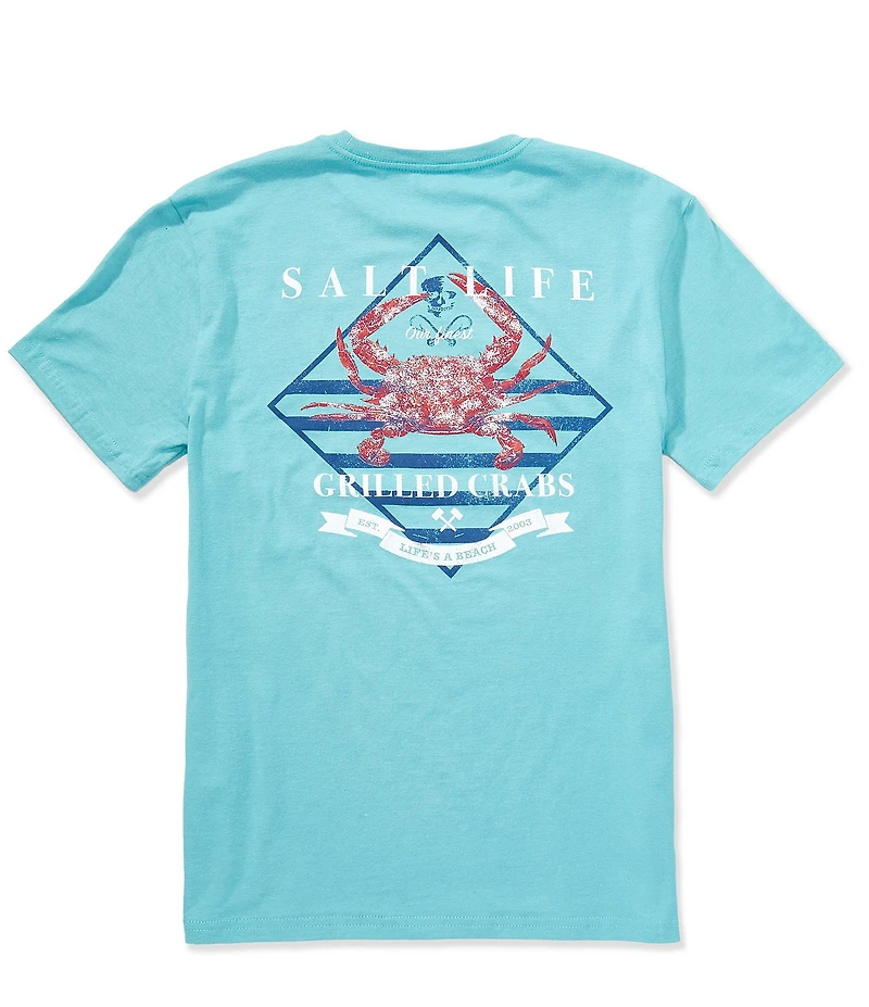 From Salt Life, this t-shirt features: Crew neckline Short sleeves Small "Salt Life" logo on the front "Salt Life" logo detail and crab art on the back Pullover construction Classic fit Preshrunk ringspun cotton jersey Machine wash/tumble dry Imported.