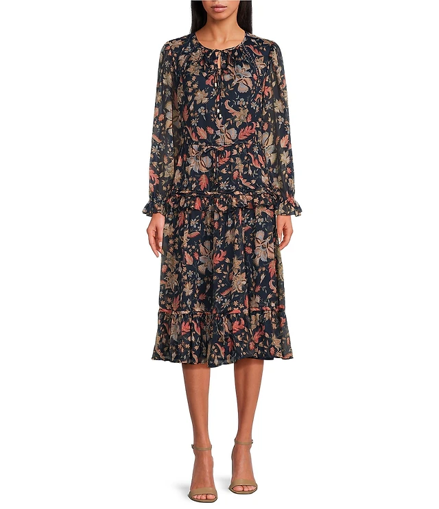 Calvin Klein Crinkle Chiffon Crew Neck Floral Print Long Sleeve Midi Dress