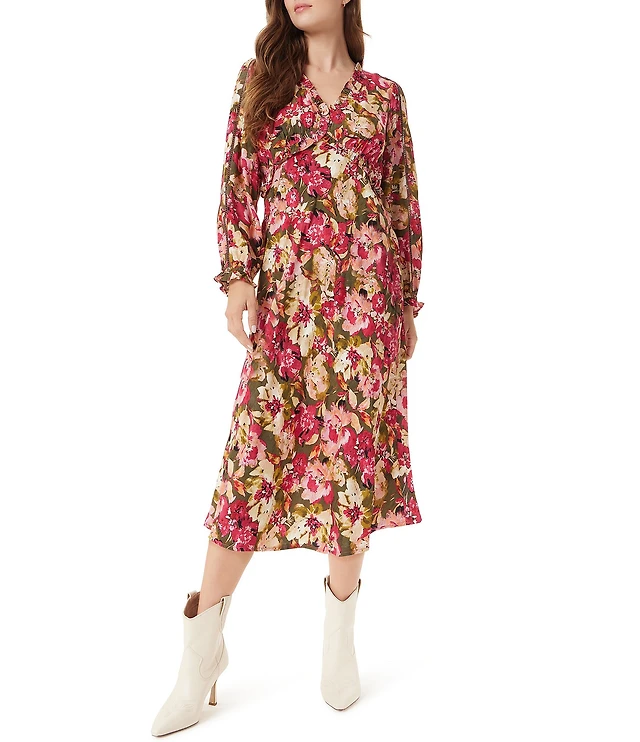 Ro's Garden Lulu Printed Woven V-Neck Long Sleeve Midi Dress