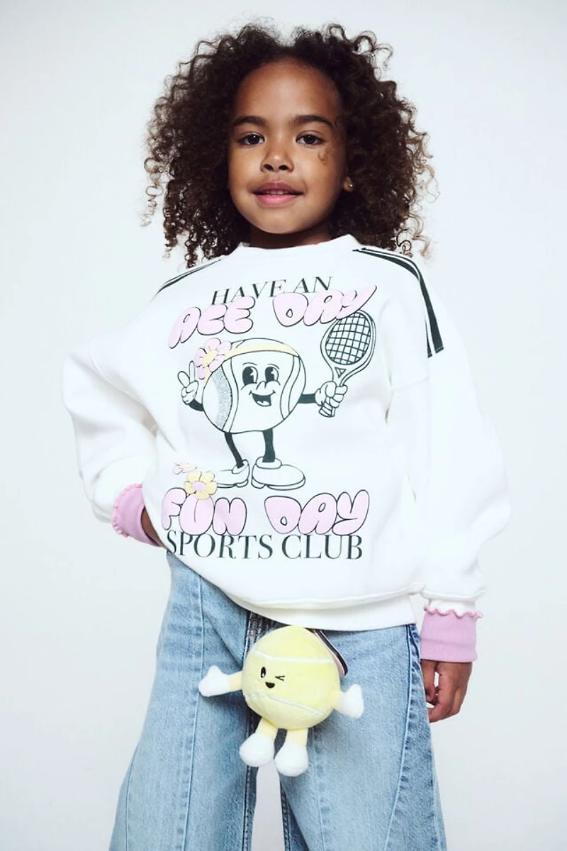 The jumper they'll actually wear. Made from heavyweight brushed fleece for all-day warmth, the Sammy Oversized Crew features an oversized fit with room to move, a crew neck, and ribbed cuffs and hem to keep its shape. The graphic print adds personality, while the fleece lining keeps them cosy while they play. Pair with trackies and this really can go with everything.
