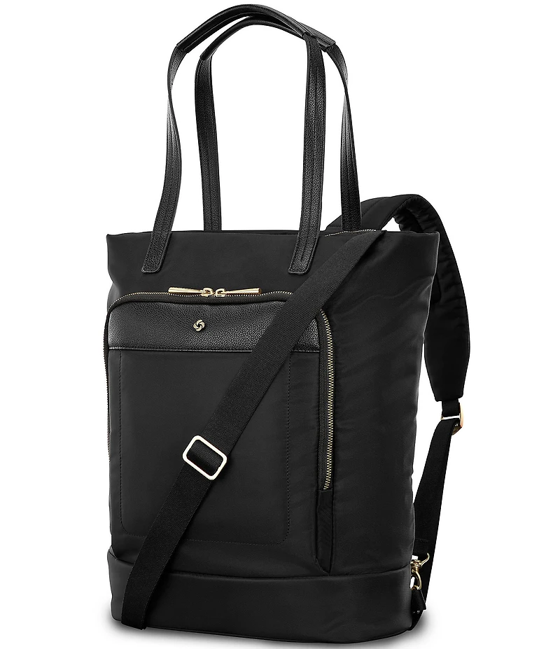 From Samsonite, this Mobile Solution 2 Convertible Backpack features: The Convertible Backpack offers three stylish ways to carry backpack, tote, or crossbody. With a padded laptop sleeve, water bottle holder, and front organizer, it's perfect for commuting or travel. Soft champagne hardware and pebbled trim add a chic touch. Organization: Dedicated 15.6" laptop compartment Interior organization includes zippered pocket and water bottle sleeve Front zippered pocket with key leash, pen sleeve, and 2 slip pockets Design: Adjustable, padded shoulder straps can be stored away when not in use Convertible design: Wear as a backpack, tote or crossbody Removable crossbody strap can be adjusted up to 56" StackIt™ Strap fits over most upright luggage handles Weight: 1.8 lbs. Specifications: Approx. external dimensions: 15.7" H x 13.9" L x 4.7" W Approx. linear dimension: 34.3" Polyester Limited 3 year global warranty Imported.