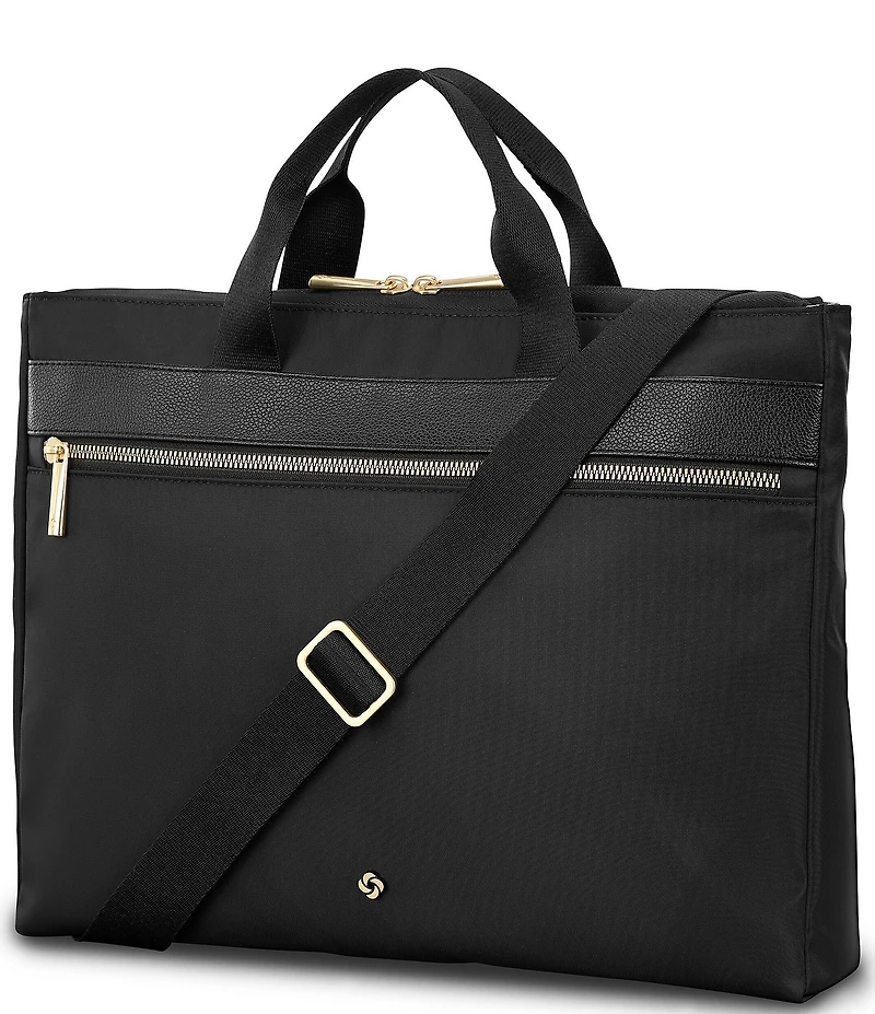 From Samsonite, this brief slim brief features: The Convertible Slim Brief features a removable strap to wear hand-carry or crossbody, a fully padded laptop compartment, interior and exterior pockets, and a StackIt™ strap for easy luggage attachment. Organization: Dedicated 14.1” laptop compartment Interior organization includes zippered pocket and water bottle sleeve Front zippered pocket with key leash, pen sleeve, and 2 slip pockets Design: Convertible design: Carry by the top handle, wear on your shoulder, or as a crossbody Removable crossbody strap can be adjusted up to 56" StackIt™ Strap fits over most upright luggage handles Weight: 1lbs. Specifications: Approx. external dimensions 15" H x 10.8" L x 2.6" W Approx. linear dimension 28.4" Polyester Limited 3 year global warranty Imported.