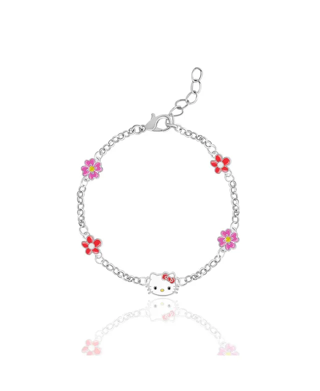 Sanrio Hello Kitty and Friends Womens Silver Plated Bracelet with Flower and Bow Charm Pendants, 6.5 + 1", Officially Licensed