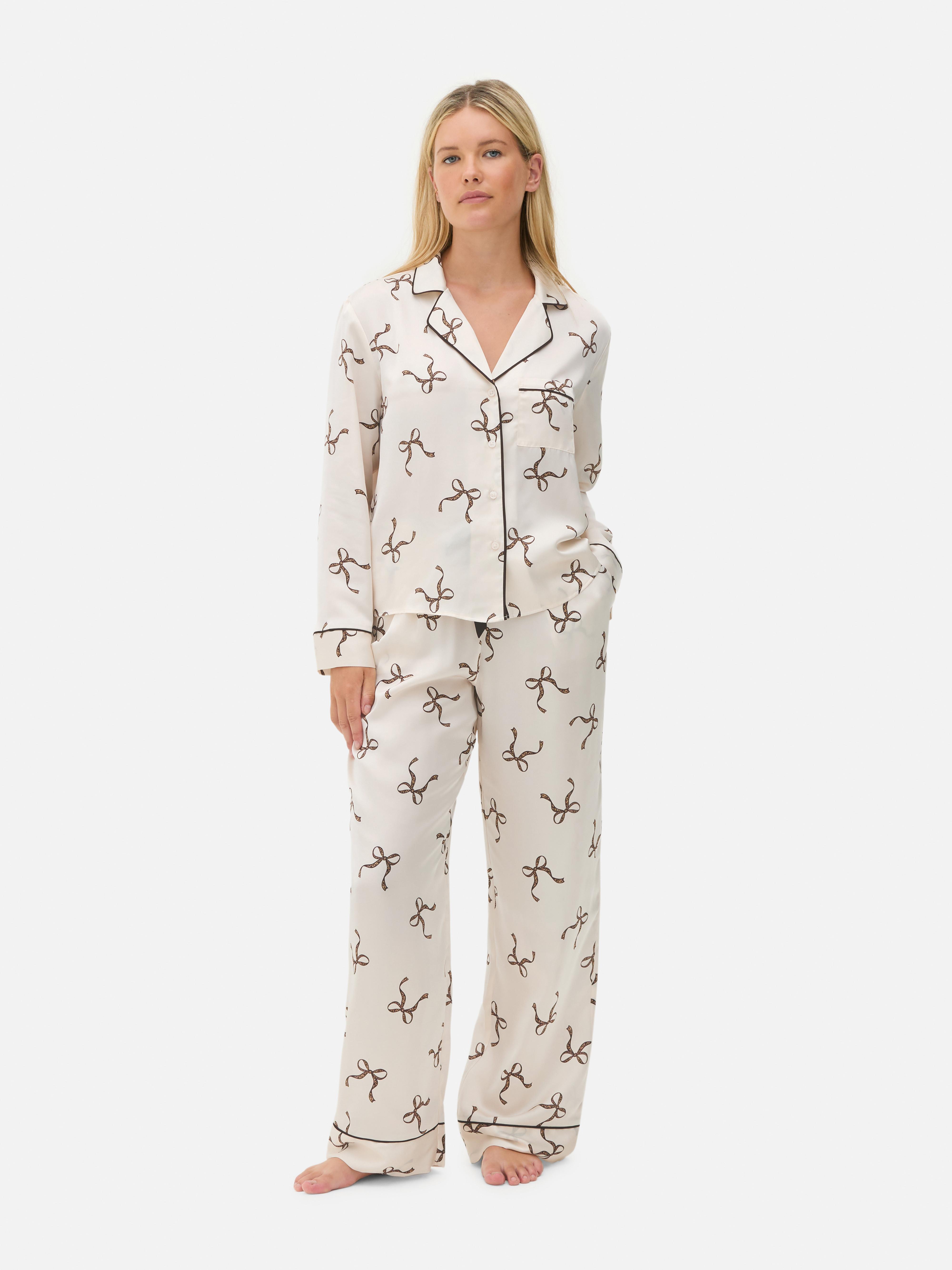 A set of boyfriend pajamas in a satin finish - collared, button through shirt and the matching straight leg pants