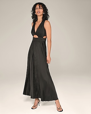 A flattering pleated maxi dress crafted in a smooth satin fabric with a double lining. This style features a v-neckline, front and side cutouts, and a back zipper closure.