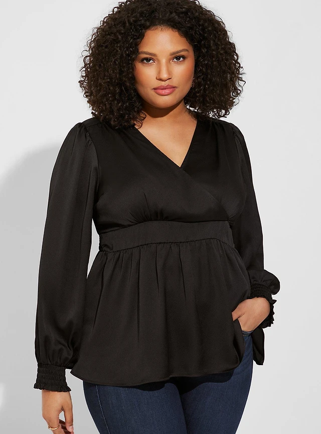 Satin Surplice Tie Cut Out Back Long Sleeve Blouse
