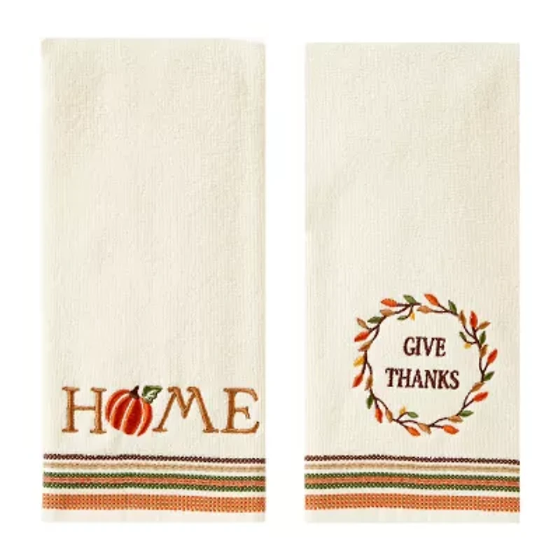 Decorate your bathroom for the fall season with the Give Thanks/Home hand towel set from SKL Home. These soft and absorbent towels feature seasonal sayings and striped trim. One towel reads "Give Thanks" and the other "Home". They can be used together or separately and look great paired with the matching Harvest Bounty shower curtain from SKL Home.