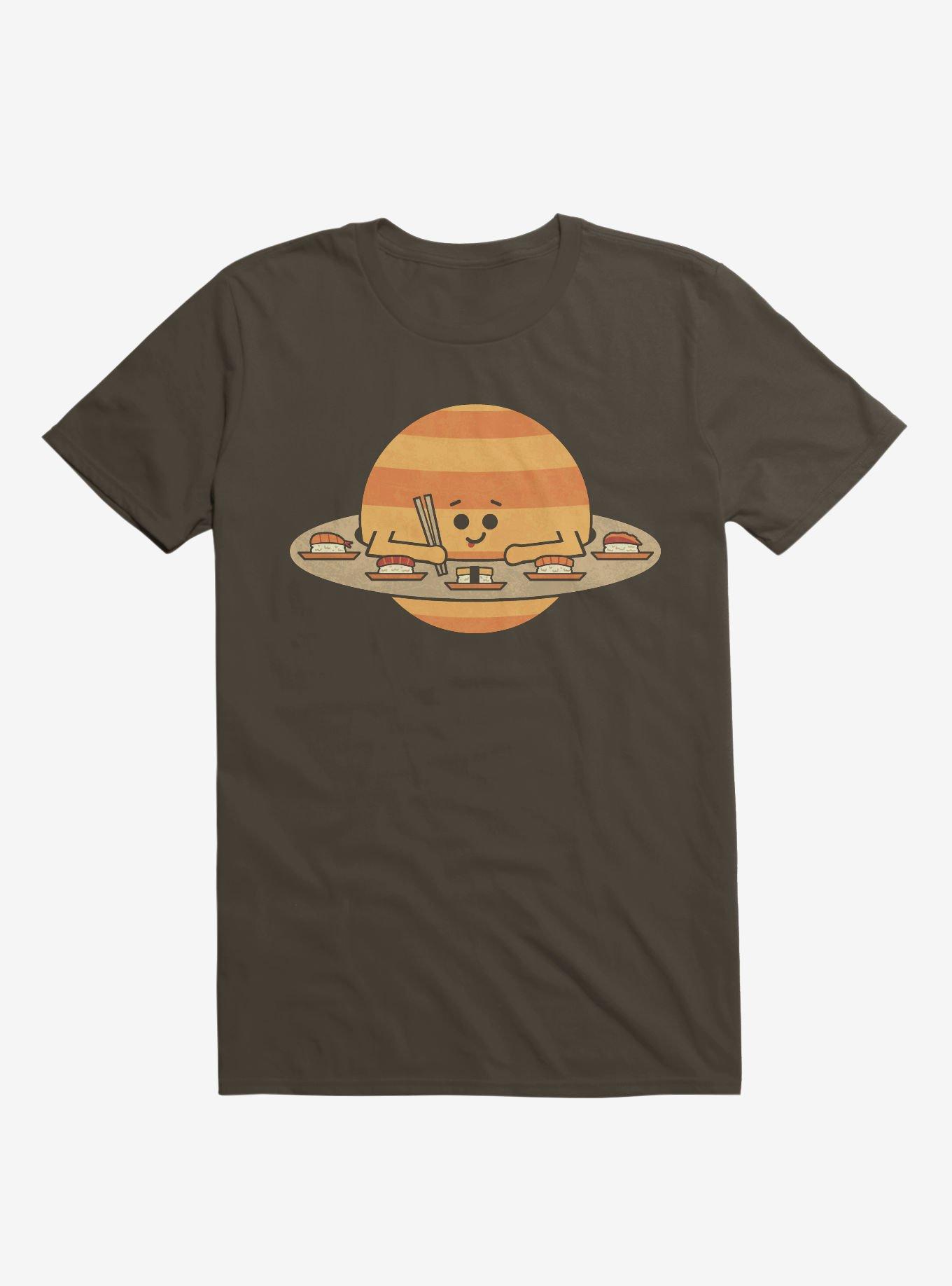 Some people call them rings -- Saturn calls them a table. This lightweight brown graphic tee features the sixth planet from the Sun enjoying some sushi. Officially licensed art from handsoffmydinosaur.