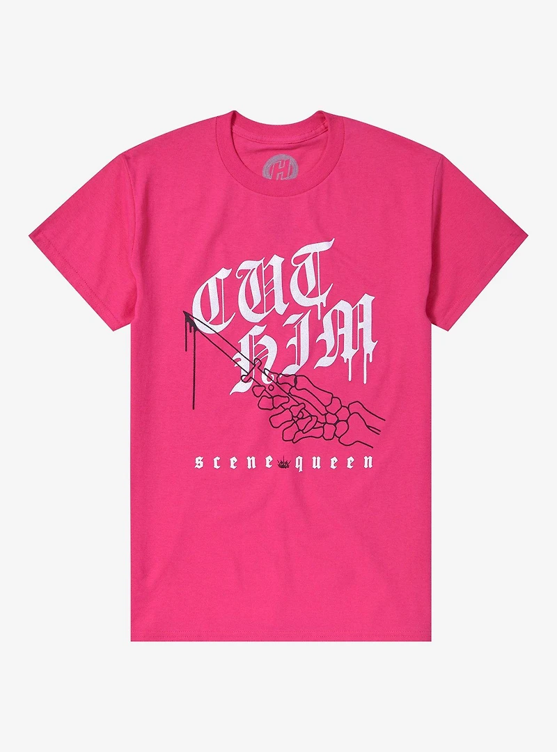 Are you a baddie on the prowl? Of course you are! Grab this hot pink Scene Queen tee repping the track "Cut Him." It shows the track name in glitter puff paint, with a skeleton hand holding a knife. Please note: Style runs large; size down for a tighter fit.